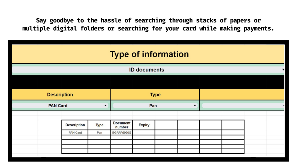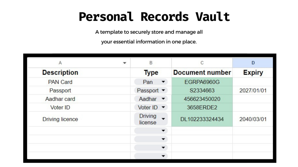 Ankit Gupta, Software Engineer, Bengaluru: "Initially, I was hesitant about putting all my details into the Personal Records Vault. The idea of entering all those bank accounts and IDs seemed like a lot of work. But when I had to make an urgent purchase for work, and my credit card was in my other bag, I realized how crucial this tool really is. Within a couple of clicks, I was able to access my card details and complete the transaction. This template is a real lifesaver!"